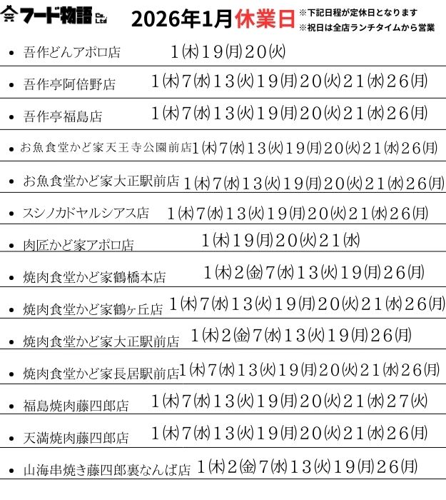 3月休業日のお知らせ 2024.02.29 お知らせ フード物語では3月上記スケジュールで営業いたします。 変更がある際にはHPにて告知をさせて頂きます。 今後ともフード物語を宜しくお願いします。 関連記事 1月定休日のお知らせ 12月定休日のお知らせ 11月定休日のお知らせ 10月定休日のお知らせ