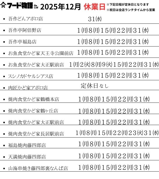 6月定休日のお知らせ 2025.05.29 フード物語では6月上記でスケジュールで営業いたします。 変更がある際にはHPにて告知をさせていただきます。 今後ともフード物語をよろしくお願いいたします。 関連記事 12月定休日のお知らせ 11月定休日のお知らせ 10月定休日のお知らせ 9月定休日のお知らせ